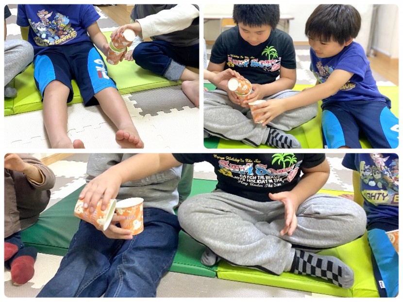 また【協力ボール送り】では、紙コップの中のピンポン玉を