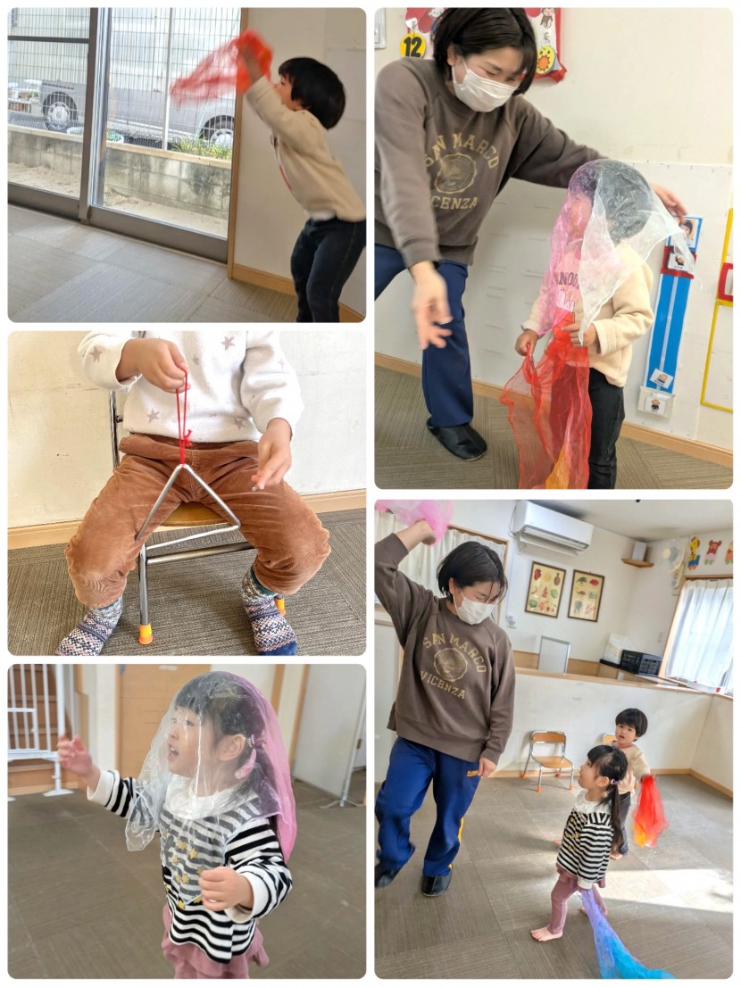 リトミックスカーフを使ってリズム遊びをしたりと